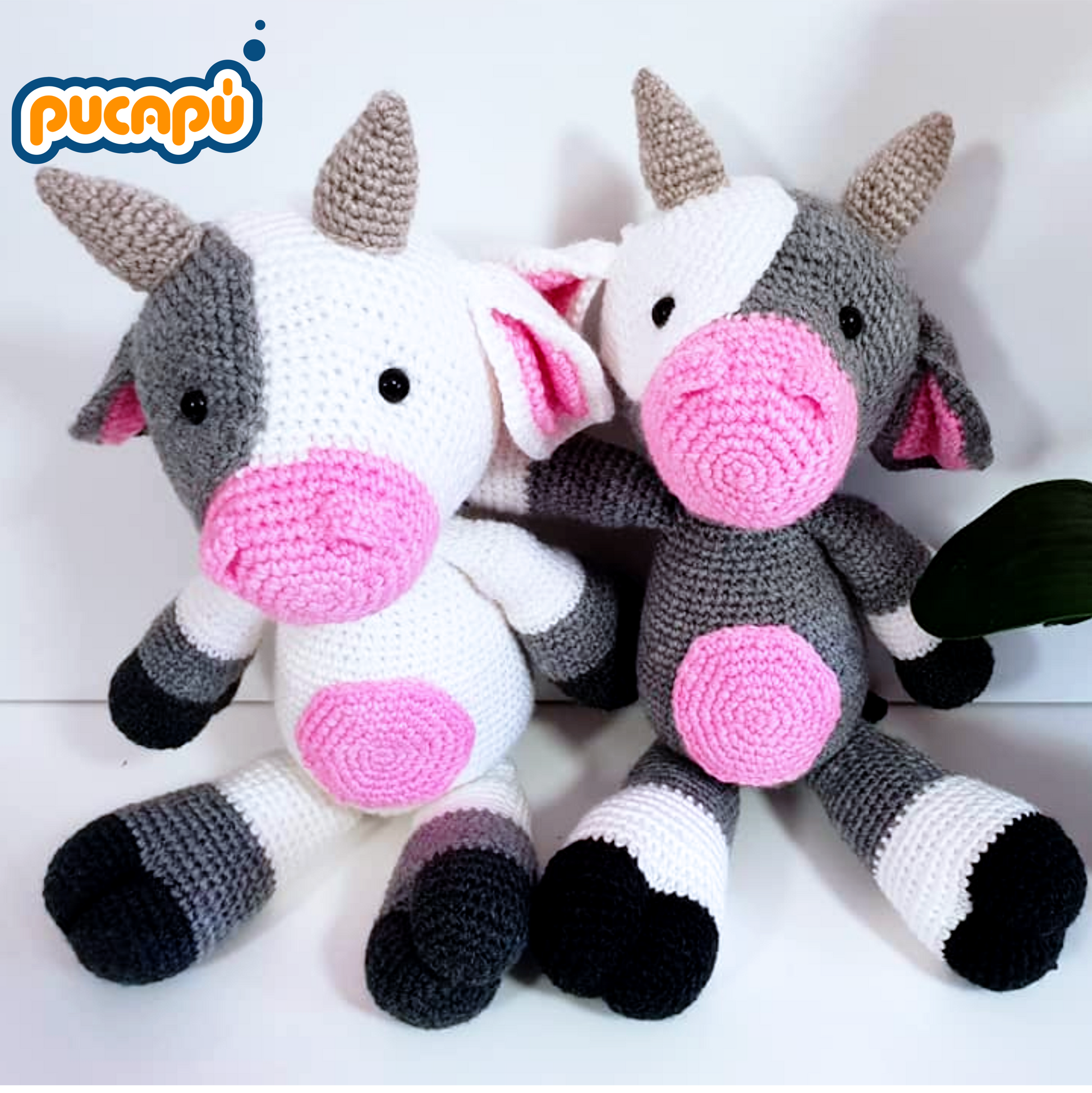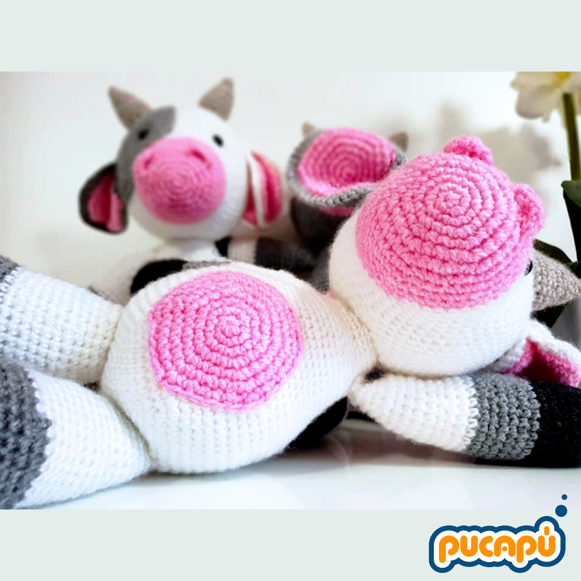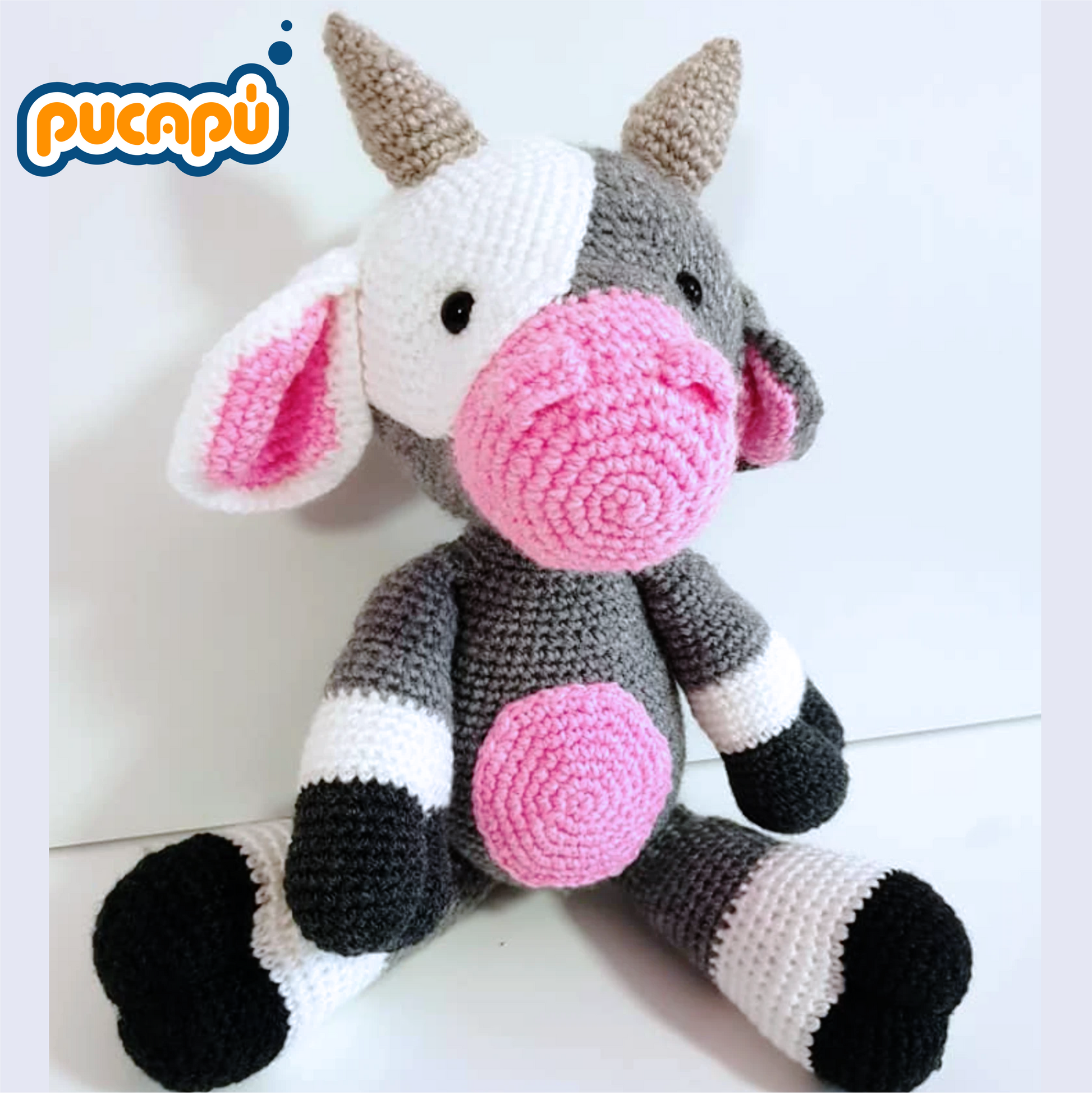 - Pieza: amigurumi de vaca con mancha en el rostro.